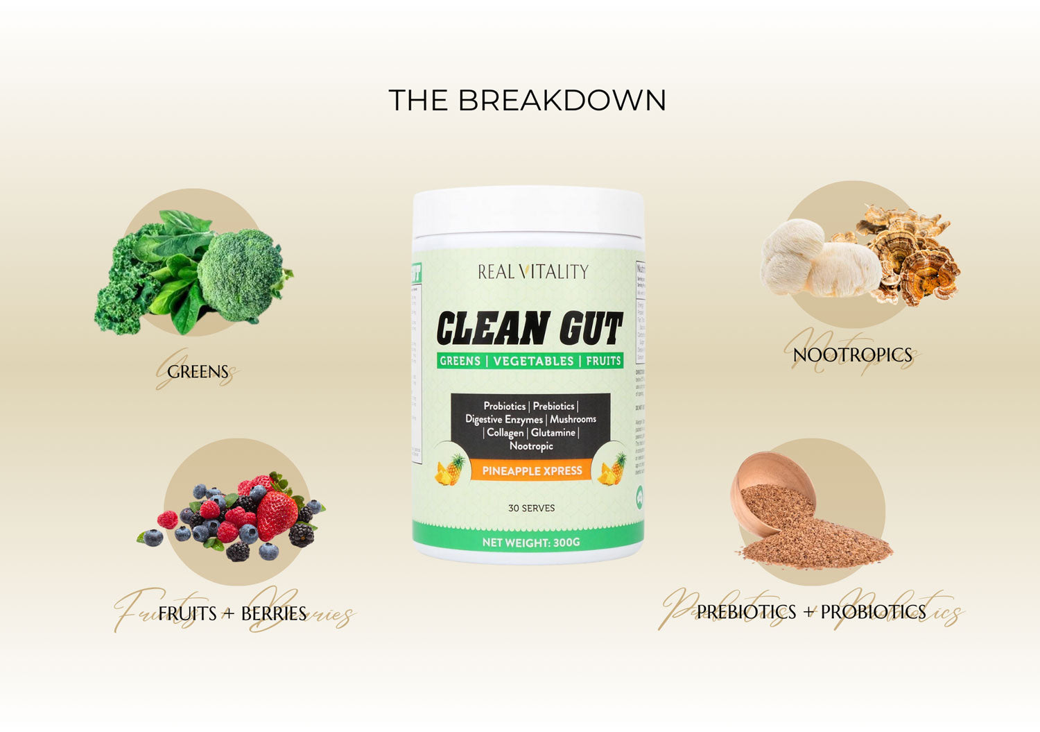 CLEAN GUT is a comprehensive nutrient-rich blend of greens, vegetables, fruits, digestive enzymes, mushrooms, probiotics, prebiotics, collagen, glutamine and nootropics along with anti-inflammatory properties designed to support gut health and wellness.